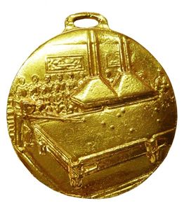 Medalla de metal de 48 mm de diámetro confeccionada por microfundición de alta definición en alto y bajo relieve. Terminación electrolítica brillante en tonos dorado plata o cobre para el 1ro, 2do y 3er colocado respectivamente, también puede realizarse añejados en los mismos tonos mencionados. Texto y logo impreso al dorso conforme pedido, las medallas vienen con cinta tricolor aunque puede seleccionarse otros colores de cintas sobre pedido.