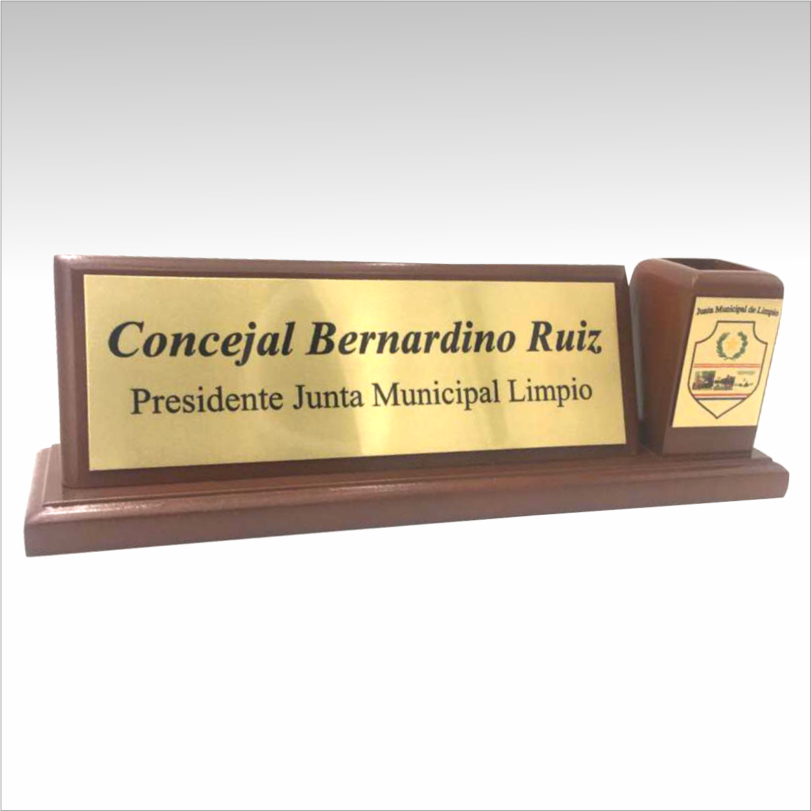 Identificador para escritorio con portalapicero de fibra de madera ecologica y texto y logo en metal impreso.